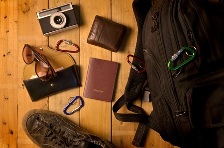 Overhead view of travel essentials including a backpack, camera equipment, and a map on a wooden surface.
