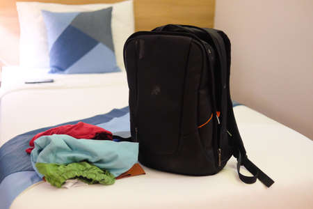 A Stylish black travelers backpack on the shore. The concept of travel, vacation, freedom.Copy place
