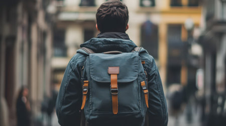 A young individual moves through a busy city street, viewed from behind, carrying a backpack. Shops and pedestrians fill the lively backdrop, highlighting urban life.
