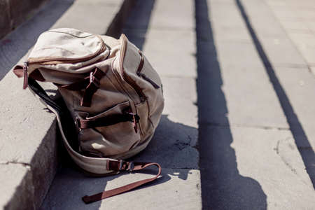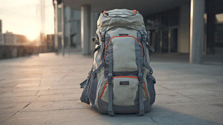 Backpack for travel and adventures is resting on the sidewalk near modern building.