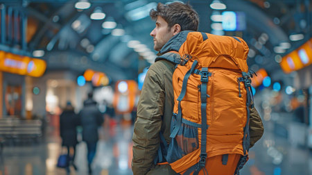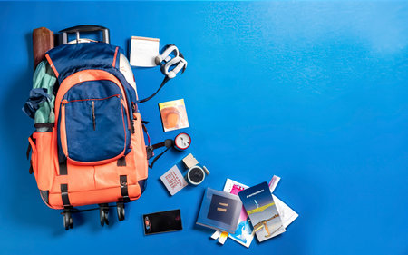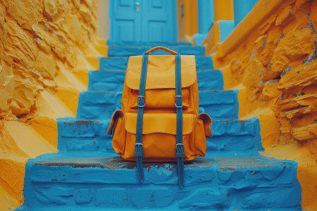 A minimalist image showing a bright orange backpack on a simple, light blue backdrop. This simple yet impactful image symbolizes adventure, travel, and exploration. Generative AI