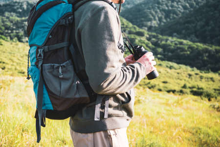 Male hiker travelers with backpack walking along mountains against the river view, active adventure vacations, Wanderlust, autumn