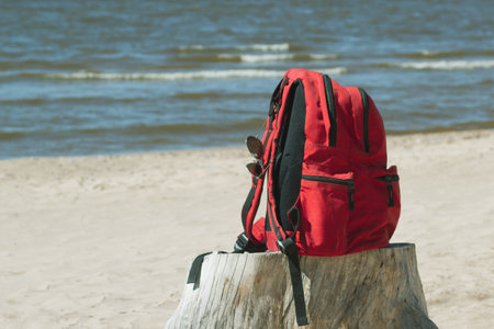 Red backpack and sunglasses on a wooden stump isolated on a sea and sand background. Sport and travel concept