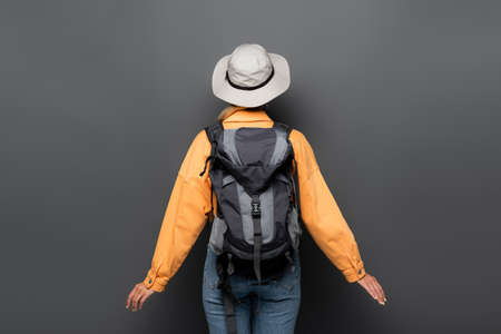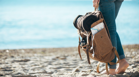 Woman traveler stand on the sand beach and holding backpack. Concept of travel.