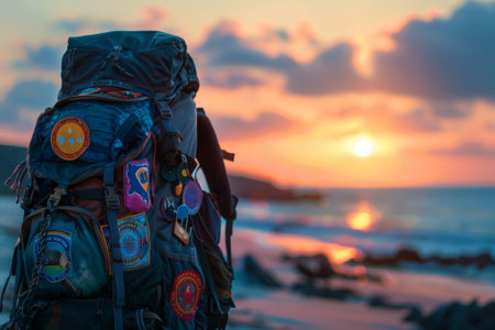 A rugged backpack adorned with patches stands on the sand as the sun sets over the horizon. Warm colors blend beautifully around the ocean waves, creating a serene atmosphere.