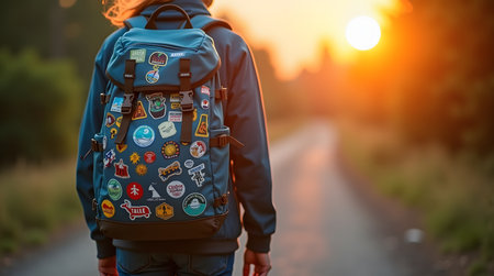 Adventurous traveler hiking at sunset with backpack covered in colorful travel destination stickers