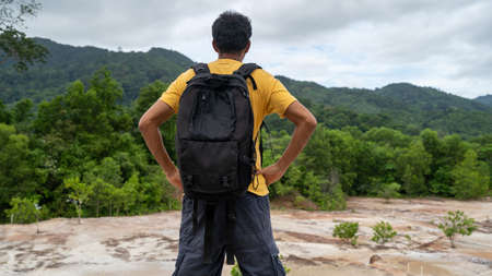 Young traveler man with backpack standing relax against landscape scenery mountain peak in phuket thailand.