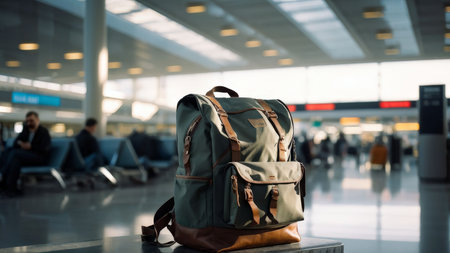 A gray travel backpack on the ground, a tourist's bag on the floor with a person sitting on chair waiting to board the plane. There is a light effect sunset.