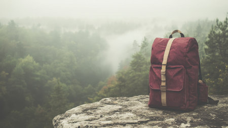 military backpack on bridge, surrounded by misty mountains and rolling hills, created with generative ai