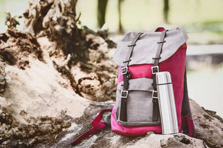 There is a tourist's brown backpack on the shore of a river. A great trip to nature in a dense green forest with a reservoir. A quiet and picturesque place for reflection and relaxation.