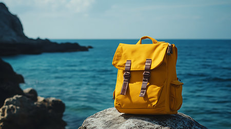 Features a vivid yellow backpack with brown straps resting on a rock formation, set against a backdrop of serene blue sea and sky under soft daylight.