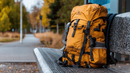 A yellow backpack is sitting on a bench in a park. The backpack is open and the straps are visible. The bench is located near a sidewalk and a street. Concept of relaxation and leisure