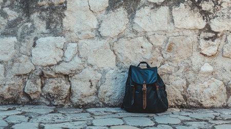 A stylish vintage leather backpack stands alone against a rugged stone wall, blending natural textures with a minimalist design. Ideal for travel or lifestyle photography.