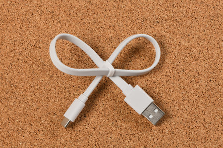 White USB cable in the form of a bow on a background of cork. High resolution photo. Full depth of field.