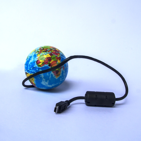 Different usb cable and globe on a blue background. Eco concept
