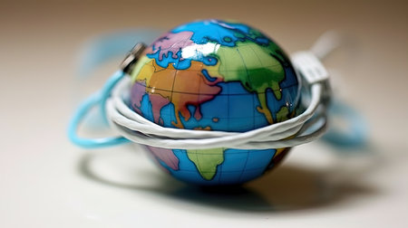 The planet earth is charging from the network, through a white cable.