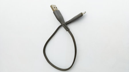 Hand showing USB cable on white surface. Perfect for technology, connection, charging, gadgets and digital communication concepts.