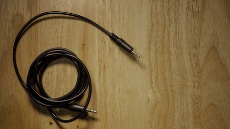 Top view of black cable on a white wooden desktop. Flat lay