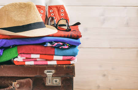 Travel board in Open suitcase packed with clothes. Summer vacations. Top view