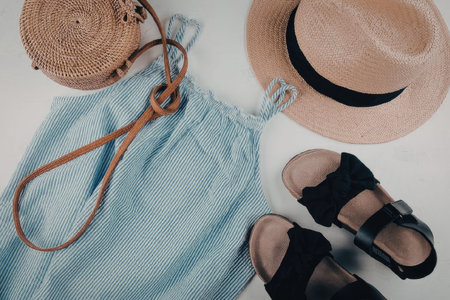 A flat lay of summer clothing and accessories including a blue dress, sandals, and a straw hat.