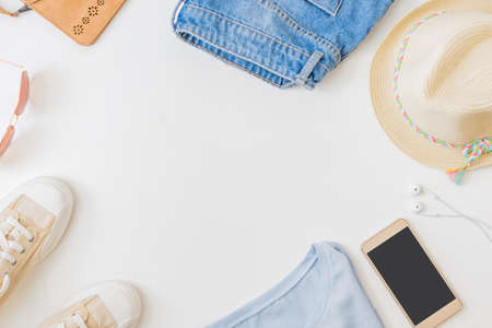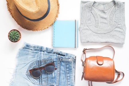 Casual spring/summer female clothing set. Vacation clothes and accessories concept.