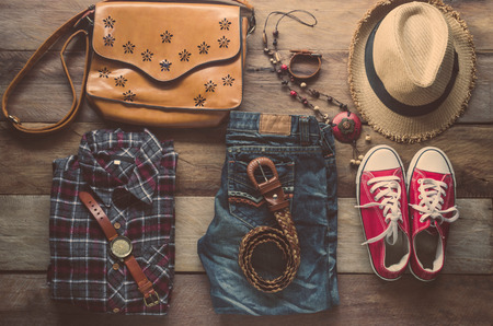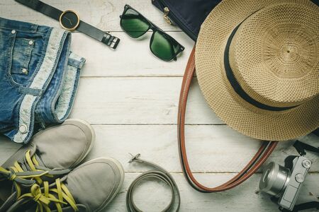 Flat lay photography of men's casual outfits, Outfits of traveler, boy, male, Men's casual outfits on wood board background - Vintage effect style picture