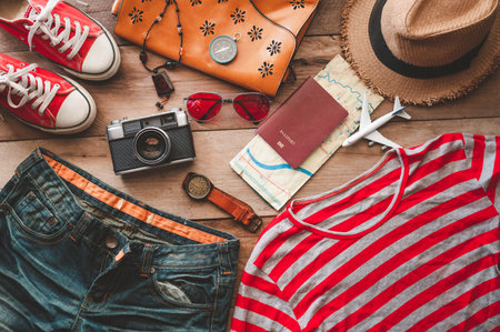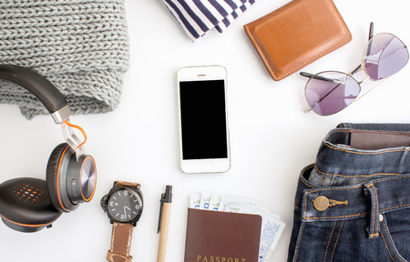 Top view clothing and pants traveler's passport ,wallet, glasses, smart phone devices, on a wooden floor in the ready to travel.