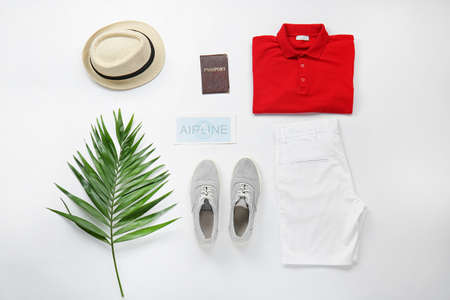 Stylish male clothes with passport and ticket on white background. Travel concept