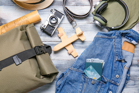 Top view of Traveler accessories and items with tourism backpack and visiting for planning vacations