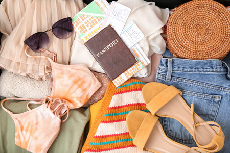 Texture of suitcase with clothes, beach accessories, passport and tickets as background. travel concept