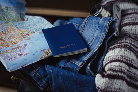 On the suitcase, clothes, passport, map and camera. Travel concept.