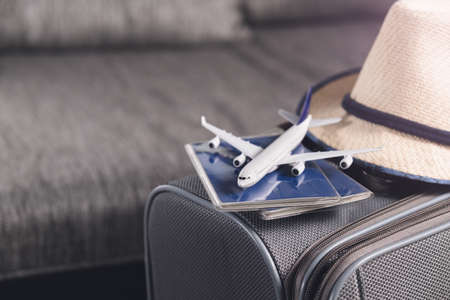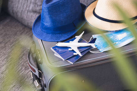 Lifestyle and traveling concept after quarantine Passports, hat and model airplane on gray suitcase Prepairing Air travel