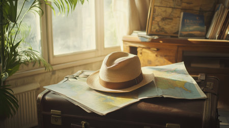 A travel hat sits atop an open suitcase, accompanied by maps and travel guides, inviting wanderlust and exploration.