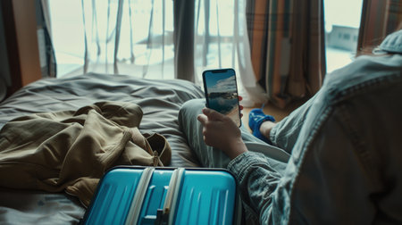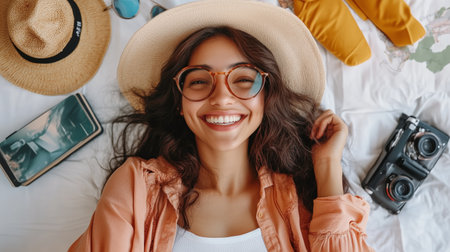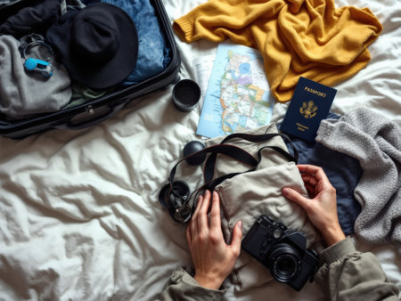 A traveler prepares for a journey packing a suitcase with clothes maps passport and camera Travel essentials are neatly arranged on a bed AIGenerated image