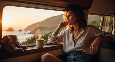 A woman relaxing in a camper van with a scenic ocean view at sunset
