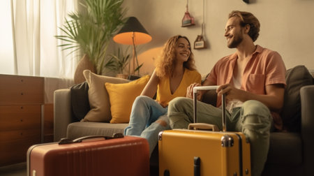 loving couple is relaxing lying on the floor at home among the suitcases before leaving for the vacations