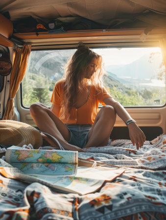 A young woman sits comfortably in the back of a campervan, her attention focused on the stunning mountain landscape framed by the vehicle's windows