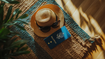 Discover a vibrant flat lay of summer travel essentials featuring a straw hat, sunglasses, and passport on a cozy rug, evoking wanderlust and sunny adventures.