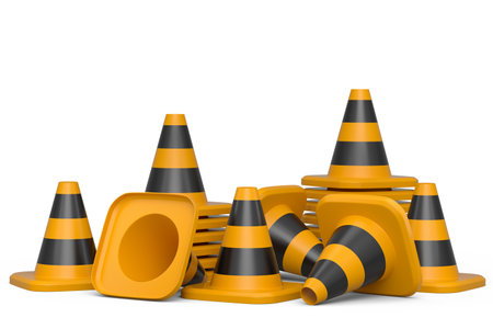 Group of traffic cones for under construction road work with hard hat or safety helmet on white background. 3d render concept of maintenance or attention warning cone