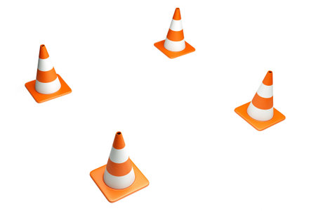 Group of orange highway traffic cones with white stripes, isolated on white background.