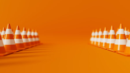 Rows of Orange Traffic cones isolated on orange background. Safety warning or under construction symbol. 3d render illustration