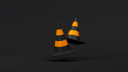 Orange black Traffic cone floating isolated on dark background. Safety warning or under construction symbol.