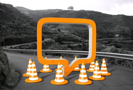 The orange cap stands on the asphalt. Warning sign on the highway. Emergency symbol. Carefully slippery road.