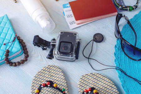 Travel accessories prepared for trip. Vintage style