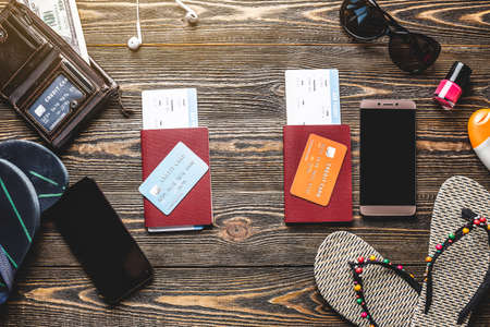 All the necessary things for the flight on vacation. Plane tickets, passport, phone and credit card on a wooden background. The concept of easy preparation for travel. Top view