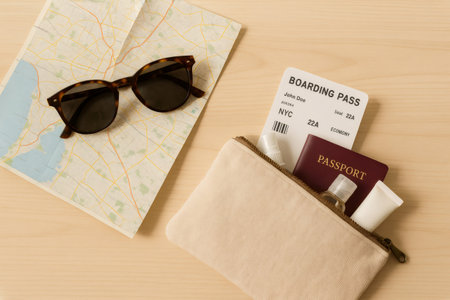 Travel kit including passport, boarding pass, map, sunglasses, sanitizer and face cream, ready for a new adventure
