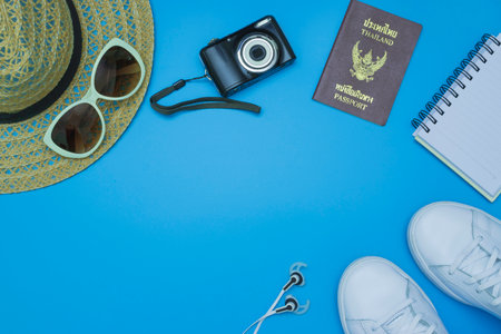 Top view essential accessories to travel concept items for trip slipper,notebook, passport, airplane,mobile phone,sunglasses on blue background.