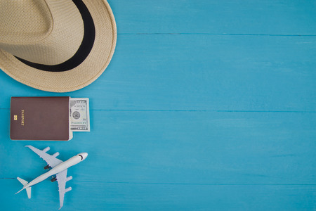 Travel Concept : Flat lay of straw hat, passport with money, plane model, on blue wooden background, with copy space.