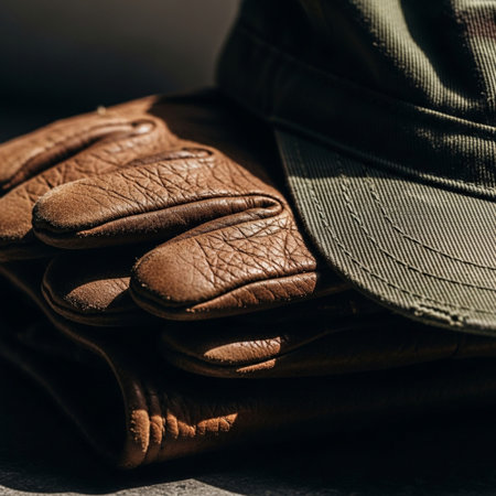 Macro detail of used leather work gloves stacked next to a worn camouflage cap under harsh window li