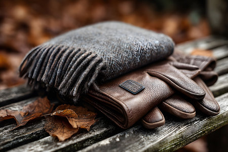 Woolen scarf and leather gloves arranged on a wooden bench amidst fallen autumn leaves. the textures and rich colors evoke warmth and comfort, ideal for fashion or seasonal themes in autumn-focused designs. Generative AI